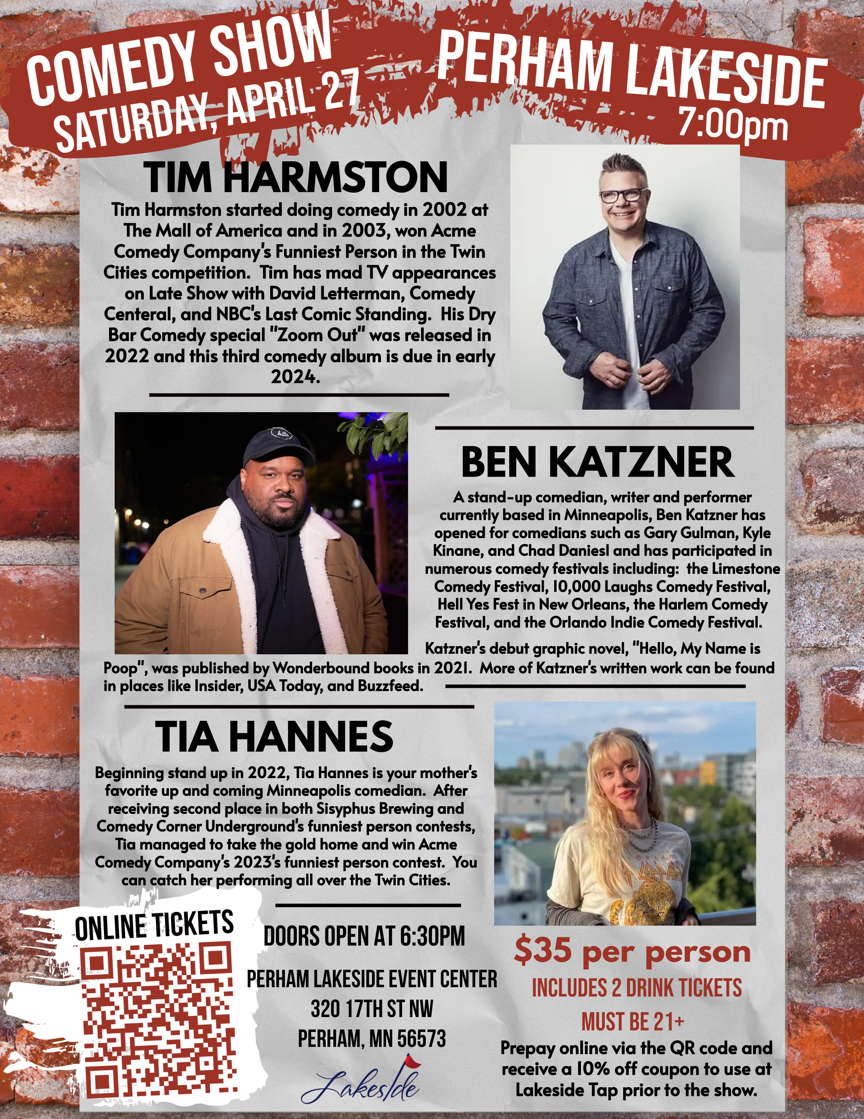 Tickets can be purchased online (at the left of this screen) or at the door. Purchase online and receive 10% off any food purchases at Lakeside Tap prior to the show by showing your emailed receipt with coupon within.