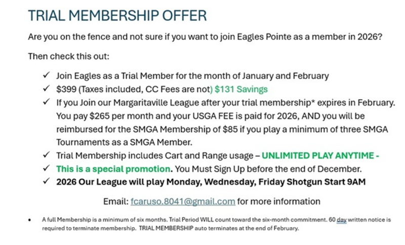 Existing Members NOT renewing Membership in 2026 - Must do so in writing to Eagles Pointe before 12/01