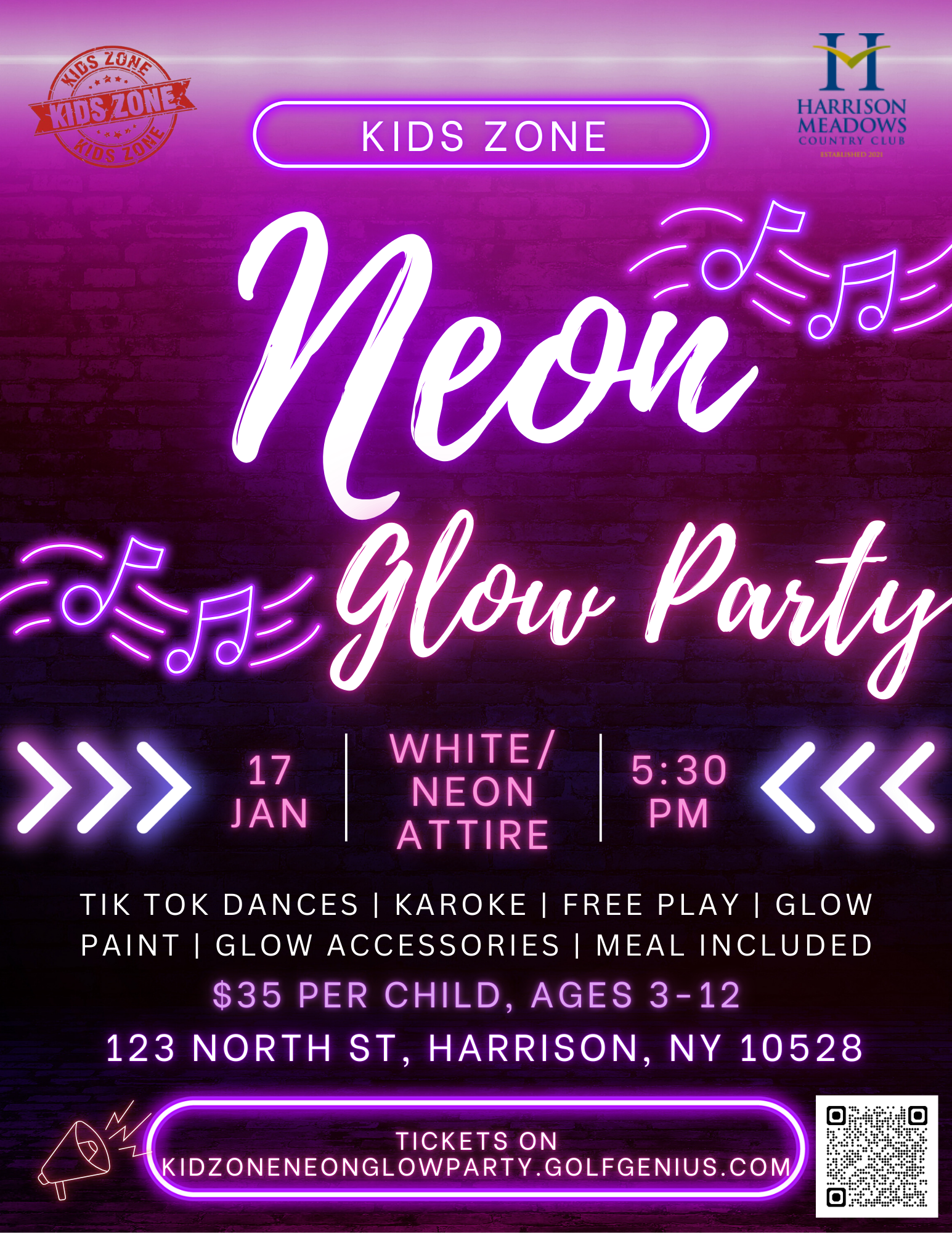 Get ready for a night that glows! Join us at Harrison Meadows Country Club for our Kids Zone Neon Glow Party, a high-energy, glow-in-the-dark event designed just for kids.