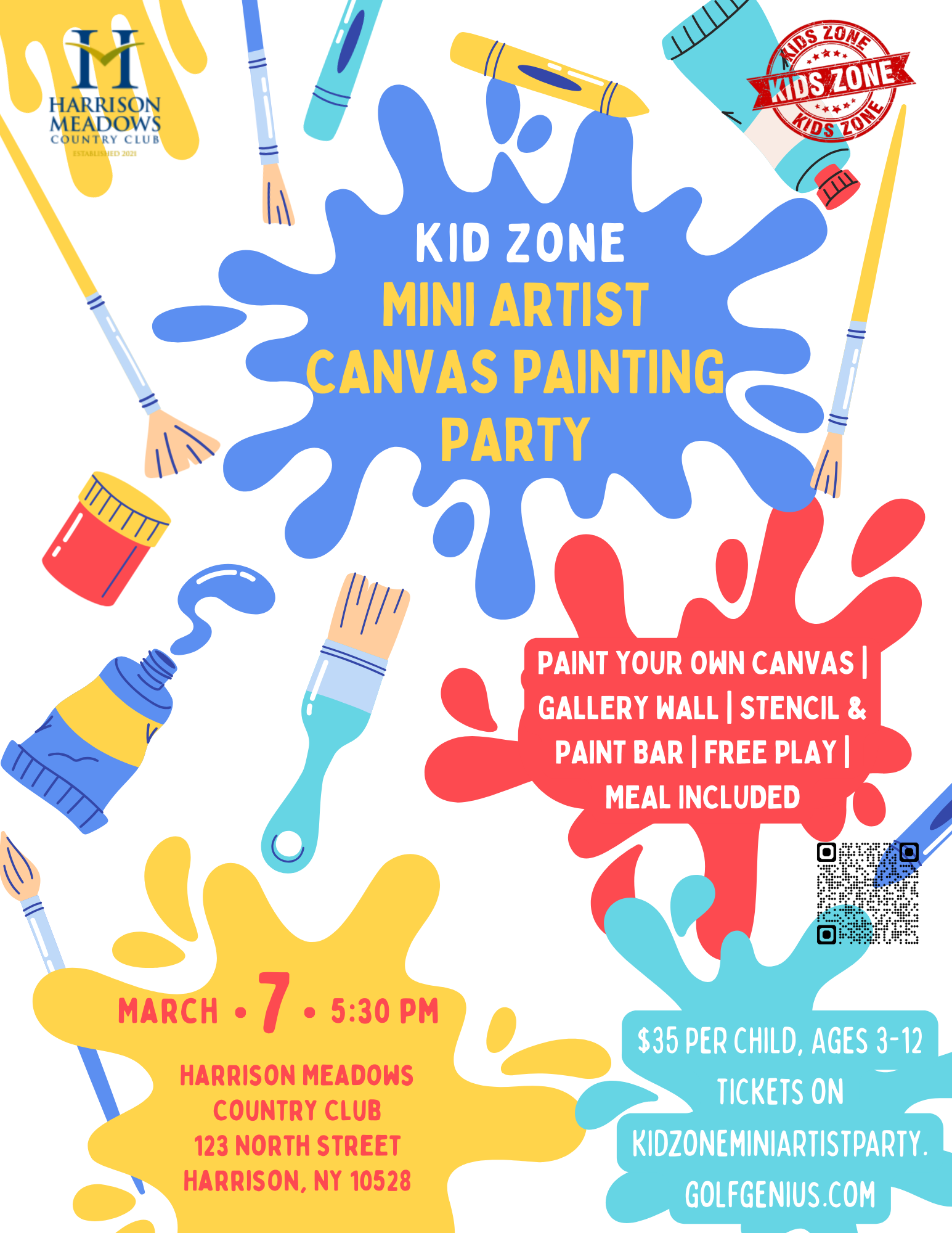 Let your child’s creativity shine at Kids Zone: Mini Artist Canvas Painting Party at Harrison Meadows Country Club! This colorful, hands-on evening invites young artists to paint their very own canvas, explore stencils and our paint bar, and contribute to a fun gallery wall showcasing their masterpieces. The night also includes free play and a kid-friendly meal in a safe, supervised environment.
