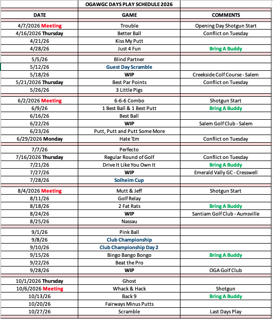 The Women's Club at OGA Golf Course season begins in April and ends in October.
