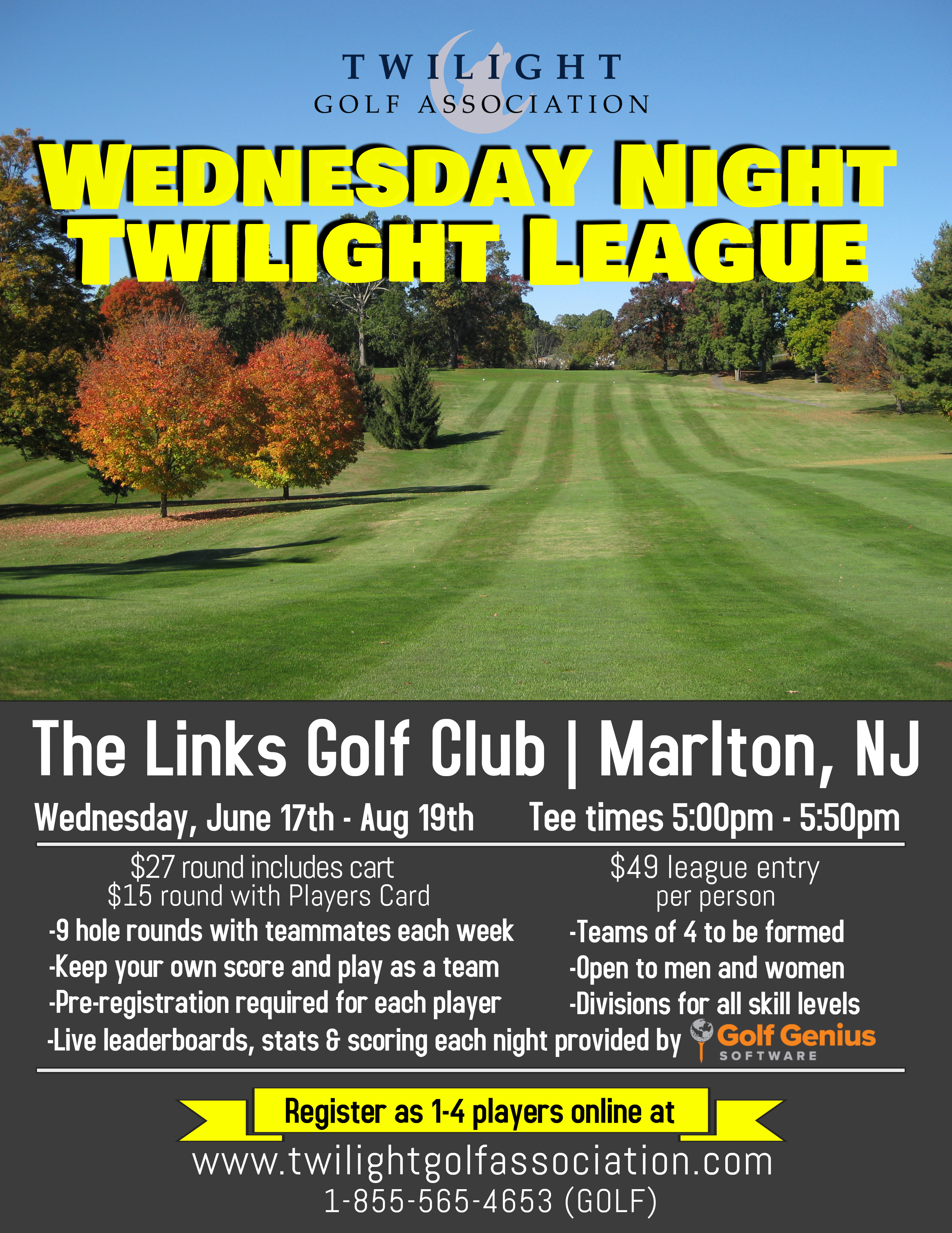 For more information, e-mail play@twilightgolfassociation.com or call 1-855-565-4653 (GOLF).