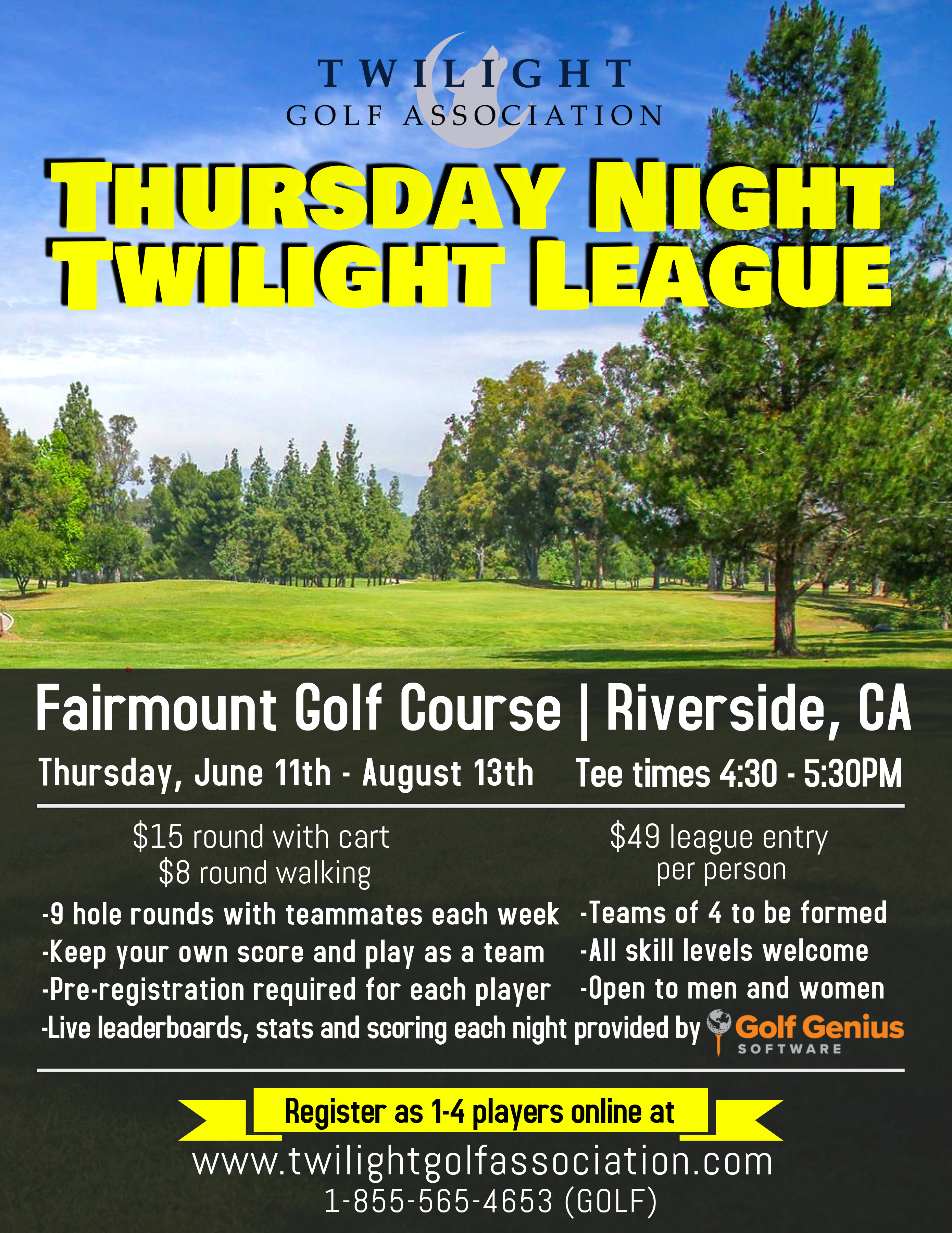 For more information, e-mail play@twilightgolfassociation.com or call 1-855-565-4653 (GOLF)