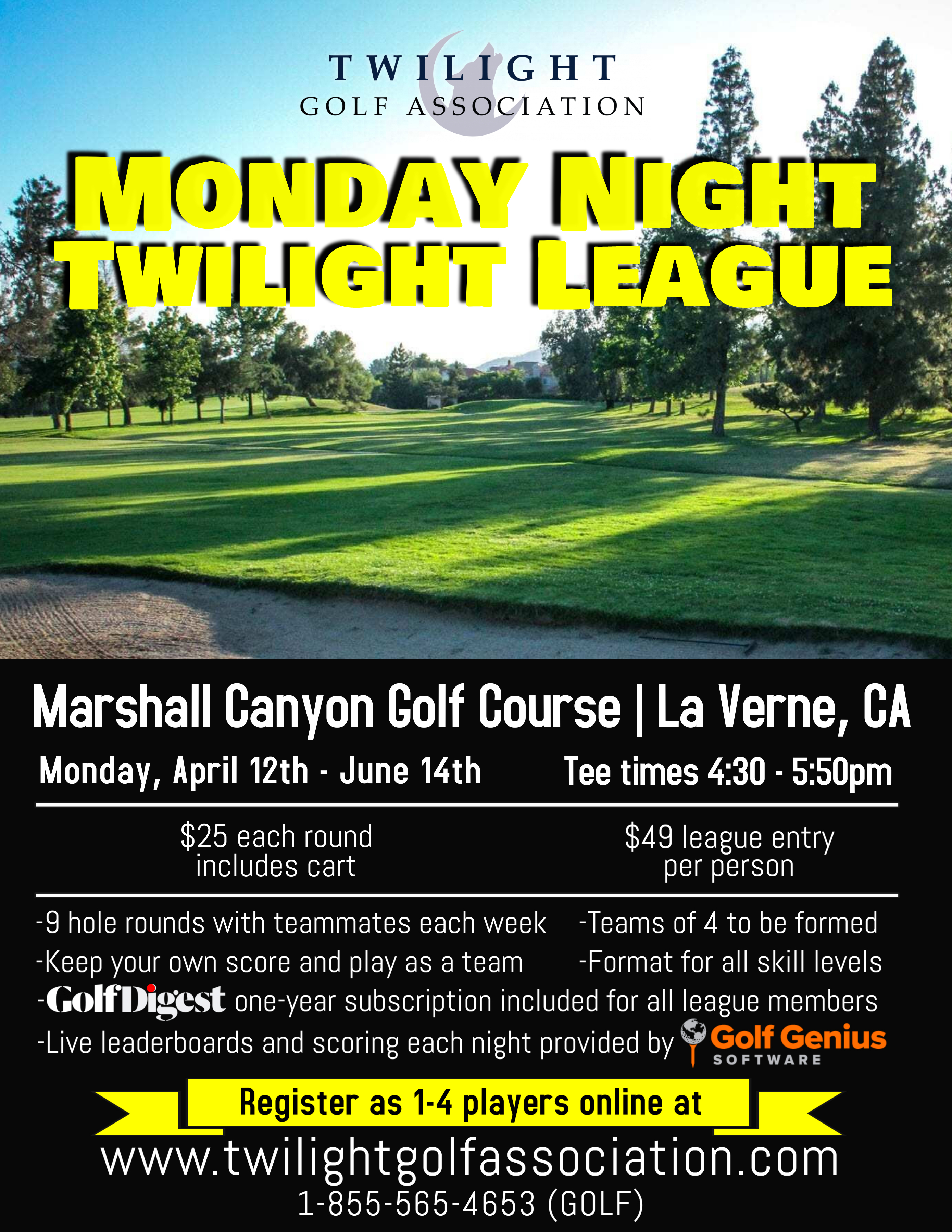 For more information, e-mail play@twilightgolfassociation.com or call 1-855-565-4653 (GOLF)