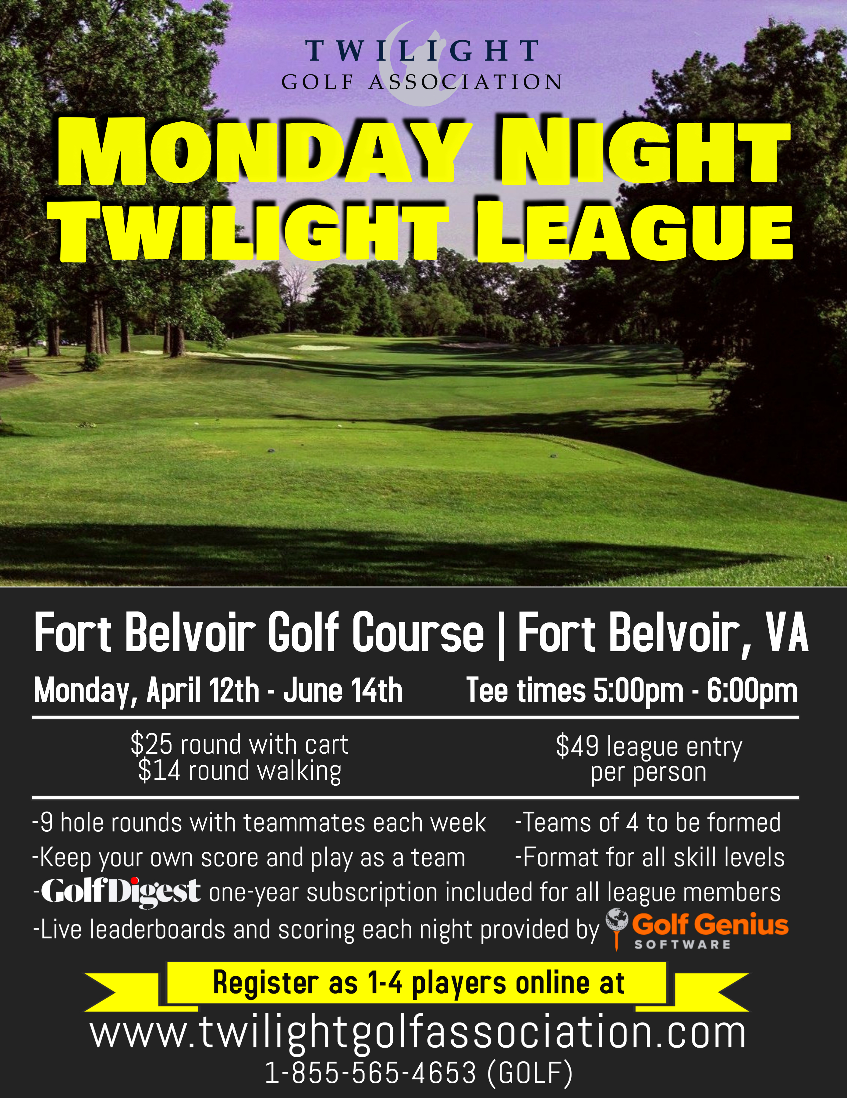 For more information, e-mail play@twilightgolfassociation.com or call 1-855-565-4653 (GOLF)