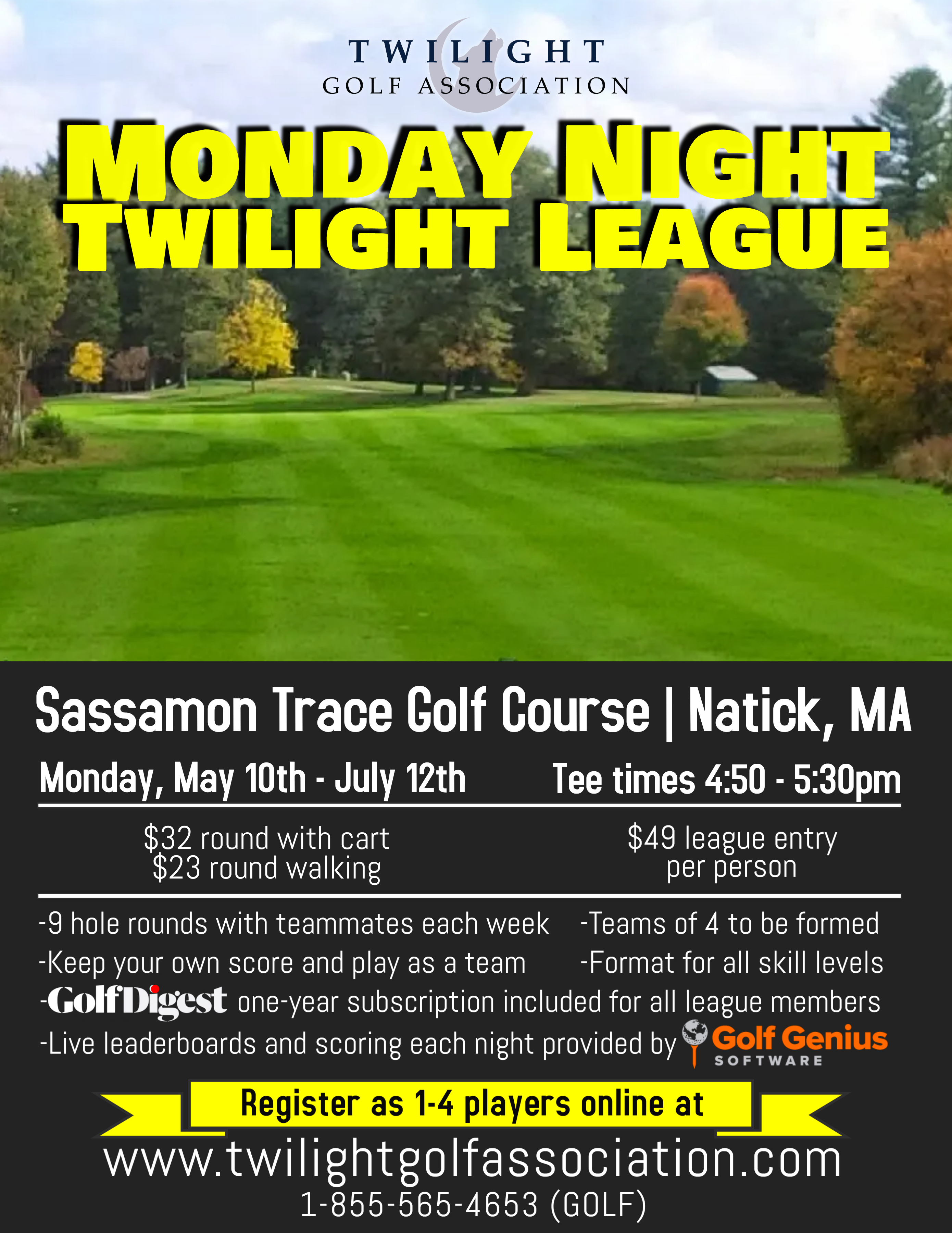 For more information, e-mail play@twilightgolfassociation.com or call 1-855-565-4653 (GOLF)