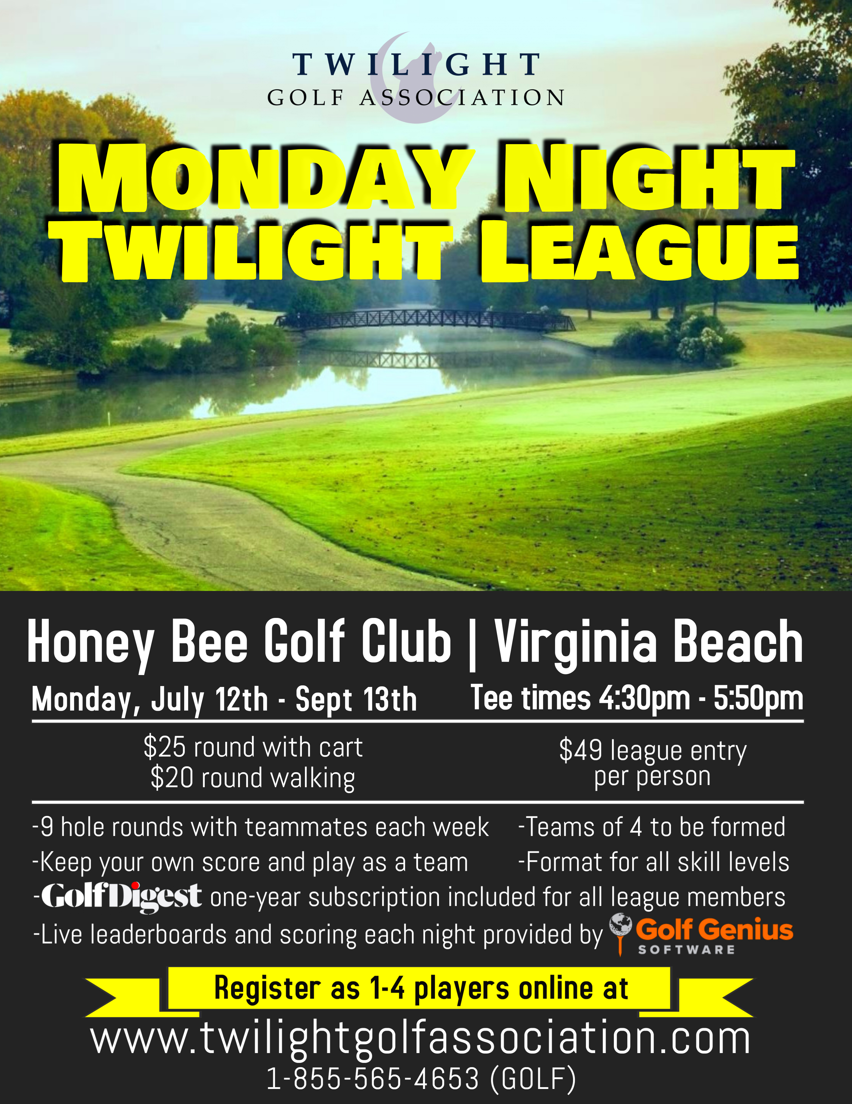 For more information, e-mail play@twilightgolfassociation.com or call 1-855-565-4653 (GOLF)