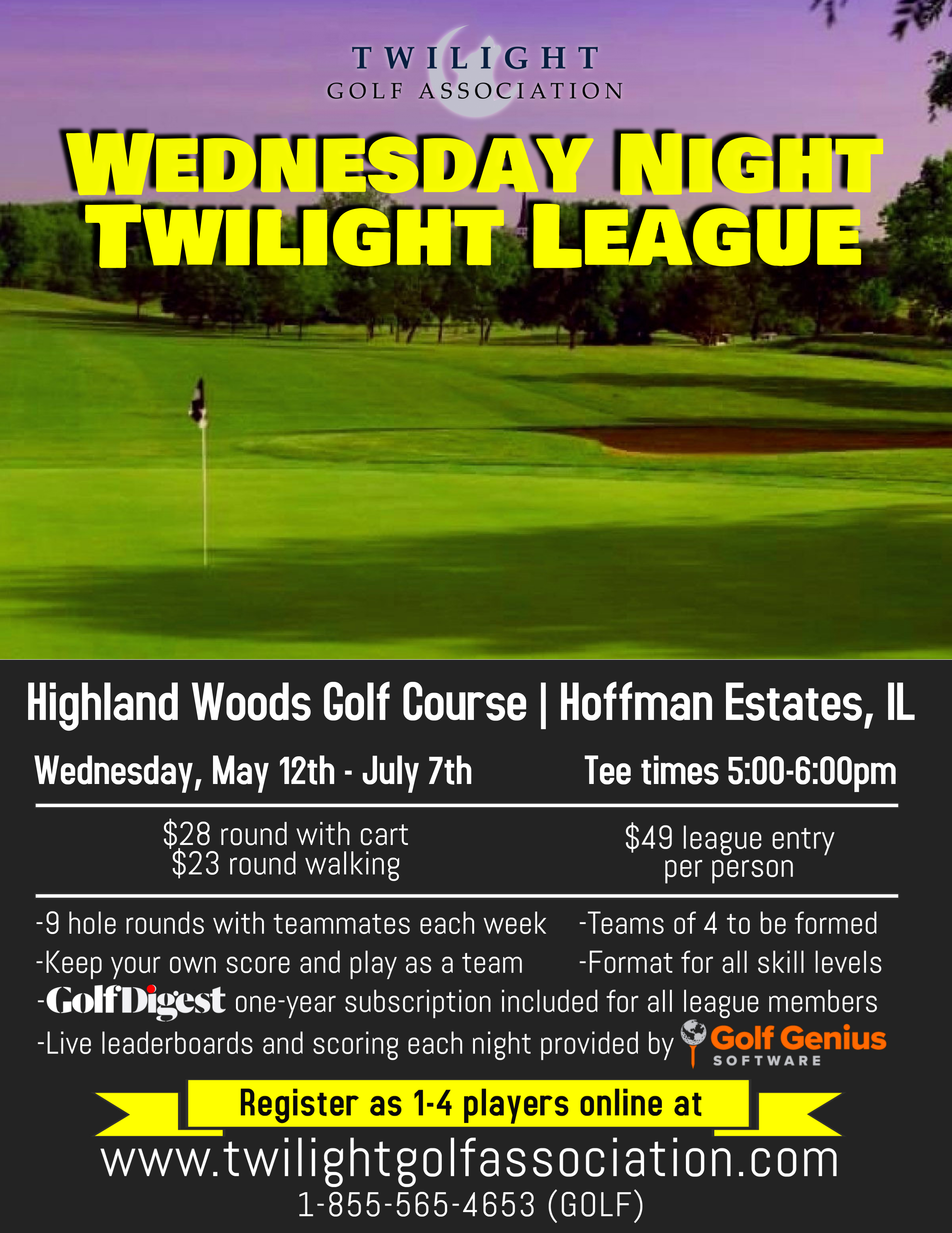 For more information, e-mail play@twilightgolfassociation.com or call 1-855-565-4653 (GOLF)