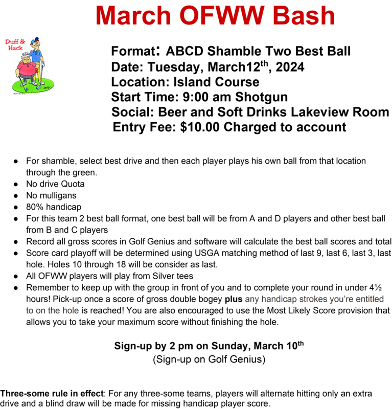 The OFWW policy allows any member to play the forward tees on the Island course without any restrictions. OFWW members can also elect to play the Combo Tees with no restrictions. Please make sure you indicate that on the tee sheet when you sign up.