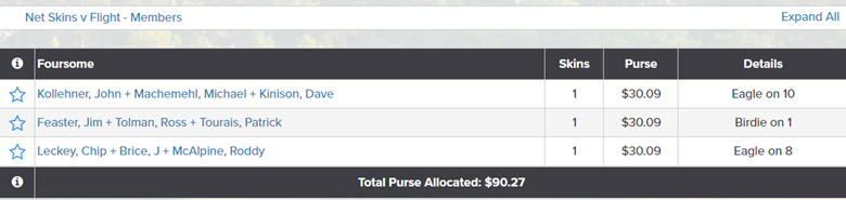 Payouts for winning are credited to your golf shop credit book account once a month. Players should check the amounts to verify they are correct. Questions about the amounts should go to Chris Reiner.