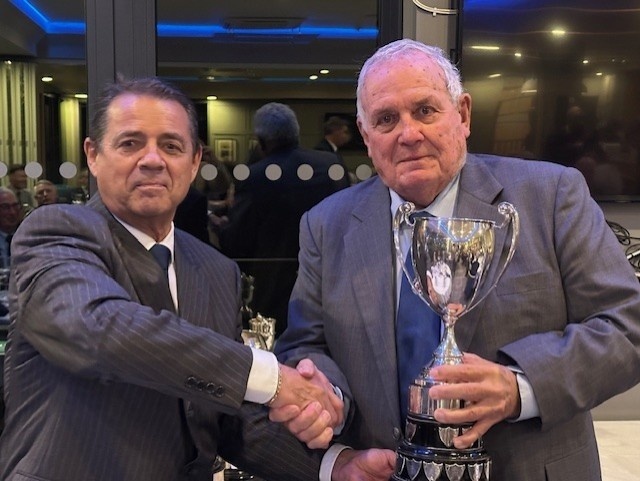 James seen here collecting the White Star Cup at the 2025 AGM Dinner from president Kevin Robertson